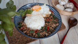 Eine kleine kulinarische Reise nach Thailand – aber keine Sorge, der Flug entfällt. Mit wenigen Zutaten und in kürzester Zeit steht euer eigenes Phat Kaprao-ähnliches Gericht auf dem Tisch: würziges Hackfleisch mit frischem Basilikum, Reis und einem Spiegelei obendrauf.