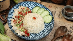 Das Hähnchenfleisch marinieren wir mit 1-2 EL Sojasauce, 2 EL Grillsauce und 1 EL Kochwein. Dazu geben wir den kleingeschnittenen Ingwer und die eingeschnittenen Lauchzwiebeln, mischen gut durch und lassen das Fleisch ca. 30 min ruhen.